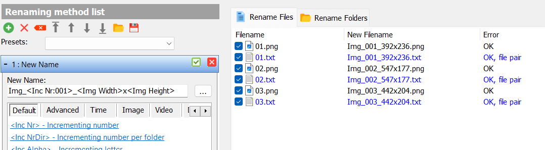 There are various methods depending on the way you want to rename your files. You can read more about the different methods in the Methods section.